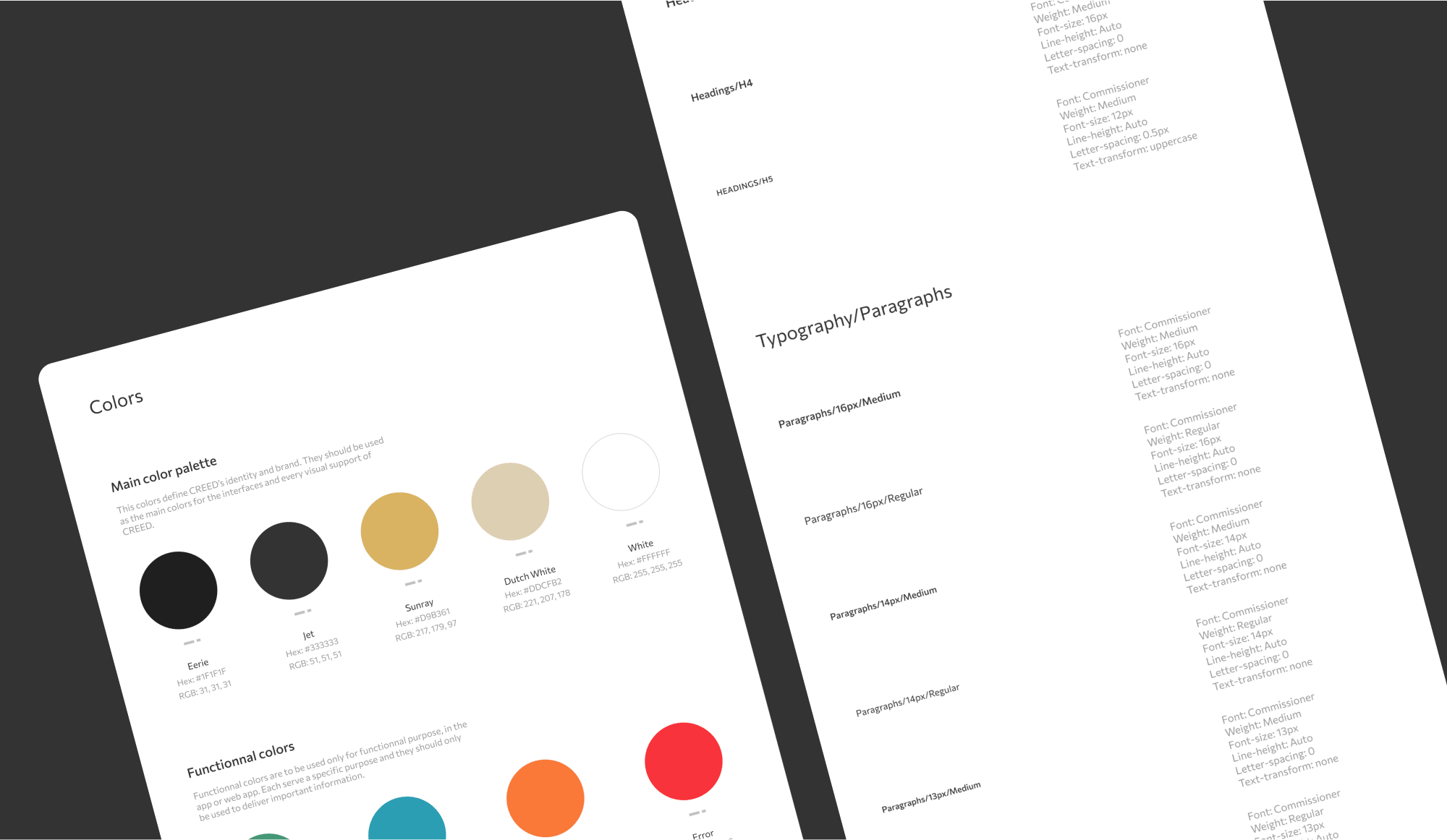 Starting with CREED's refreshed logo and typeface, I developed a comprehensive color system designed for flexibility and accessibility. I introduced additional shades to improve contrast ratios and defined semantic color roles (success, warning, error) to support future feature development.