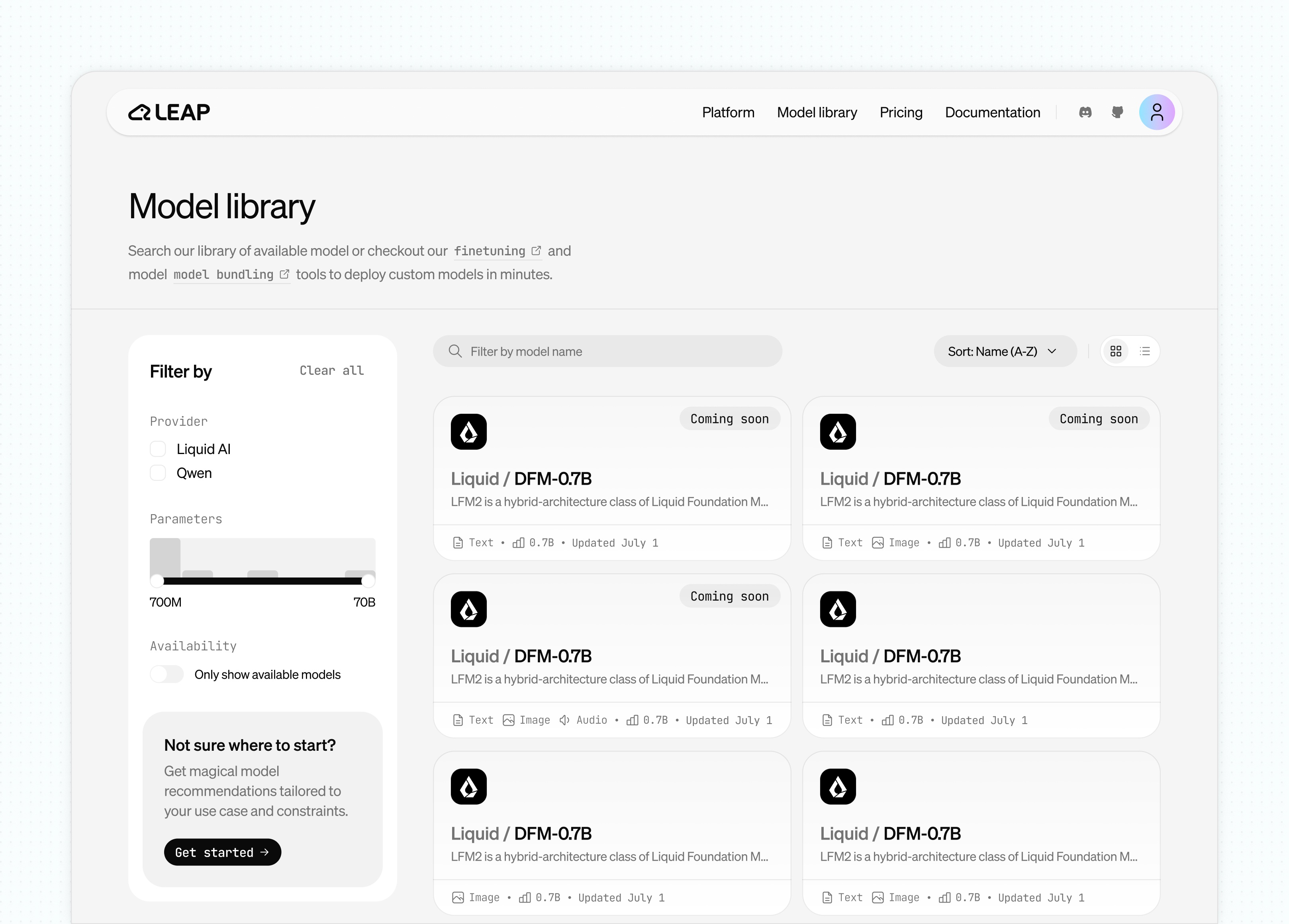 LEAP's core value proposition: helping developers quickly find the right model for their use case (chat, text-to-speech, embeddings, etc.). The Model Library was our first major feature.