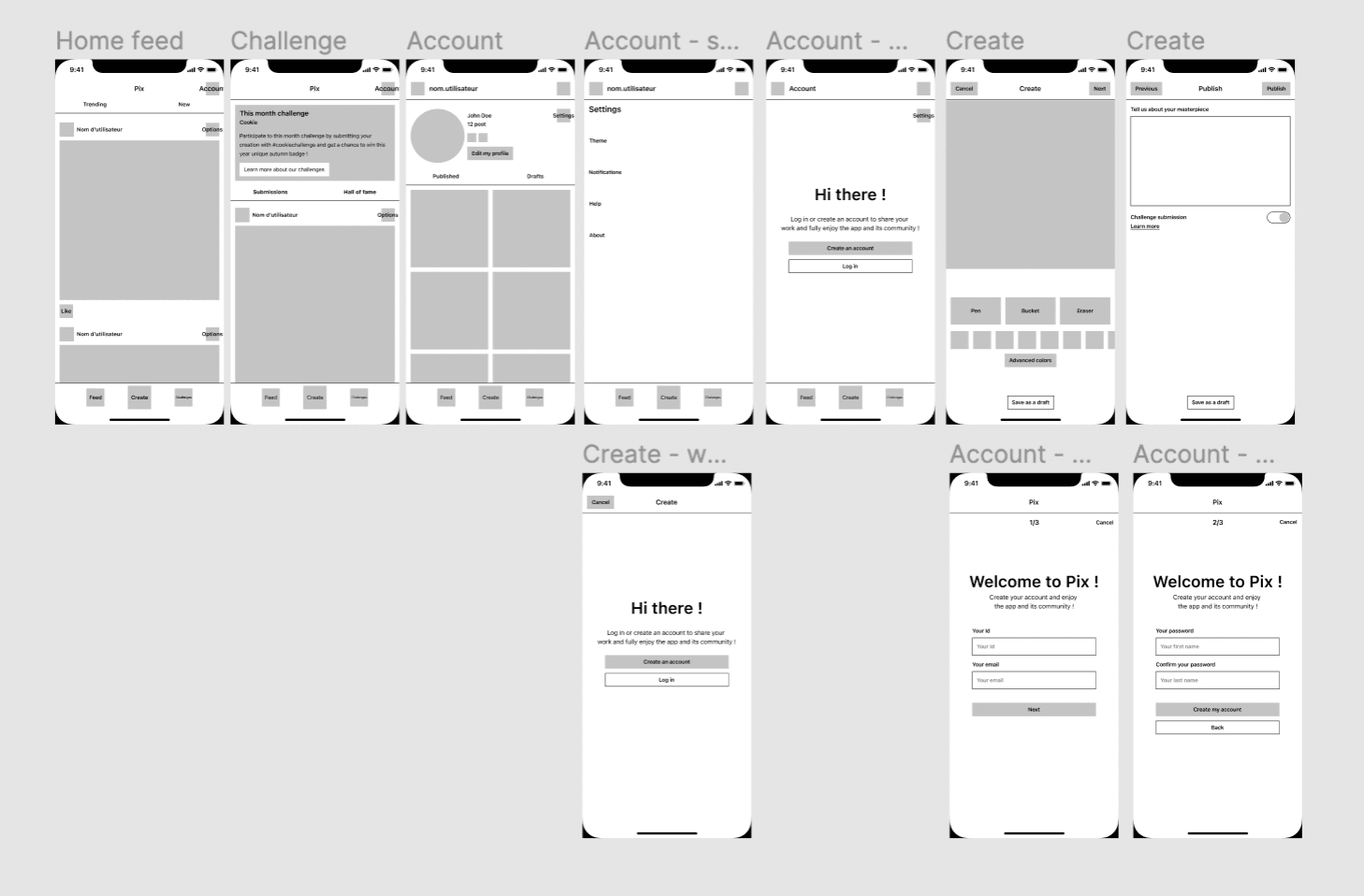 This project was created in collaboration with Maxime Nory. We had one vague idea in mind: to conceive something for people to create with, it could be a blank canvas, a game,anything. After a bit of discussion, we finally came to a concept: a pixel art Instragram inspired app. Pix is a social network AND a pixel art editor.